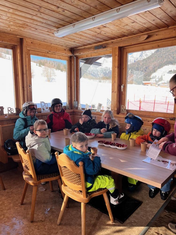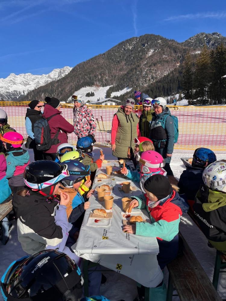 Bei strahlendem Sonnenschein erschienen die Kinder und Pädagoginnen der VS Hochfilzen um 8:30 Uhr vollzählig beim Lift. Dort warteten bereits die Skiclubtrainer und einige Eltern, die uns als Begleitpersonen unterstützten. Nach der Einteilung der Gruppen ging es gleich los - es wartete wieder ein abwechslungsreiches Programm auf die Kinder. Neben dem Pistenspaß, wo spielerisch die richtige Skitechnik vermittelt wurde, sorgte David Danzl für zusätzliche Spannung mit einer kindgerechten Lawinensuche. Im Zielhaus konnten die Kinder zwischendurch Pause machen, etwas jausnen und besprachen die Pistenregeln. Nach dem intensiven Vormittag gab es mittags eine Stärkung mit Würstl, Tee und köstlichem Kuchen.